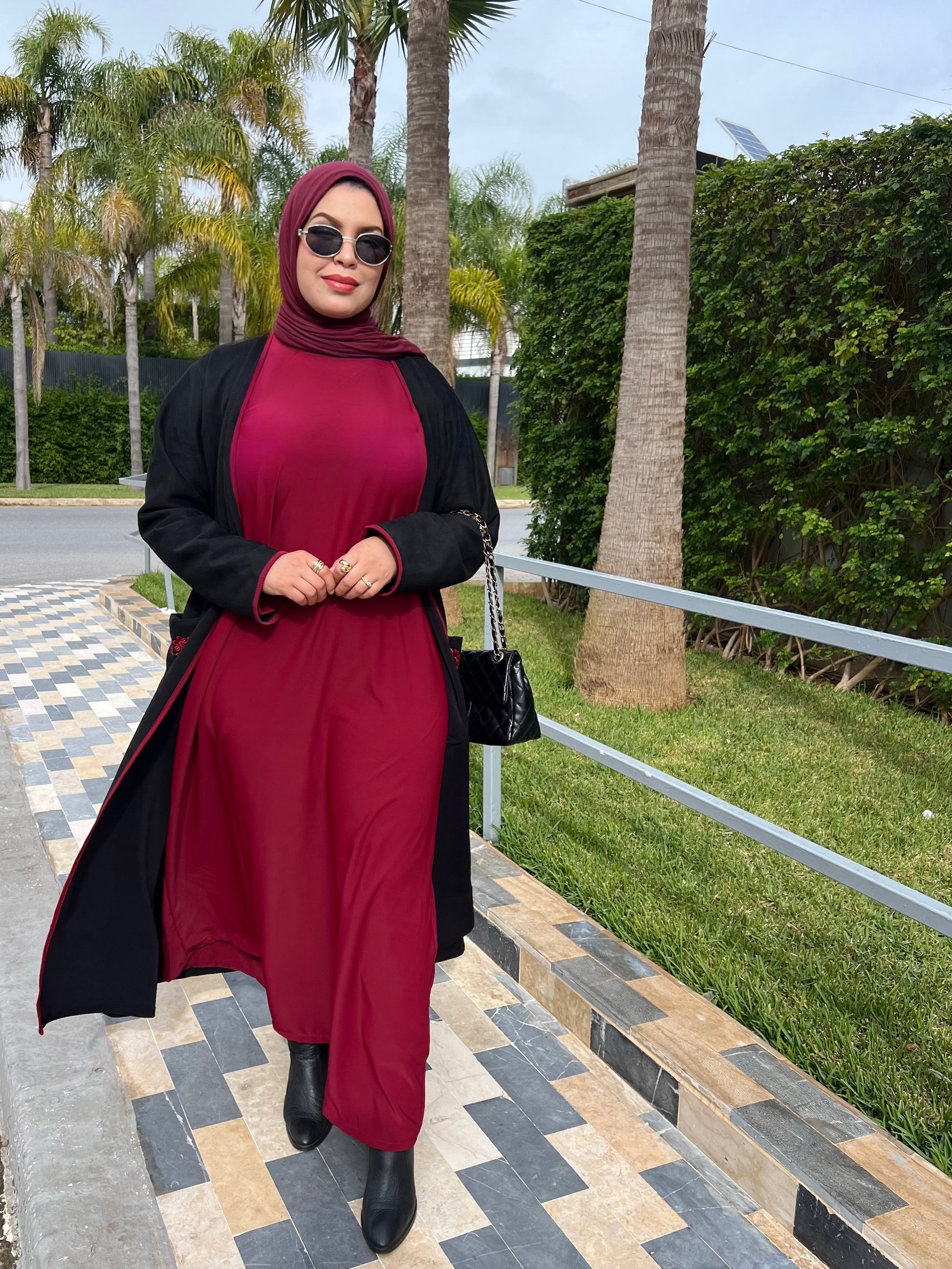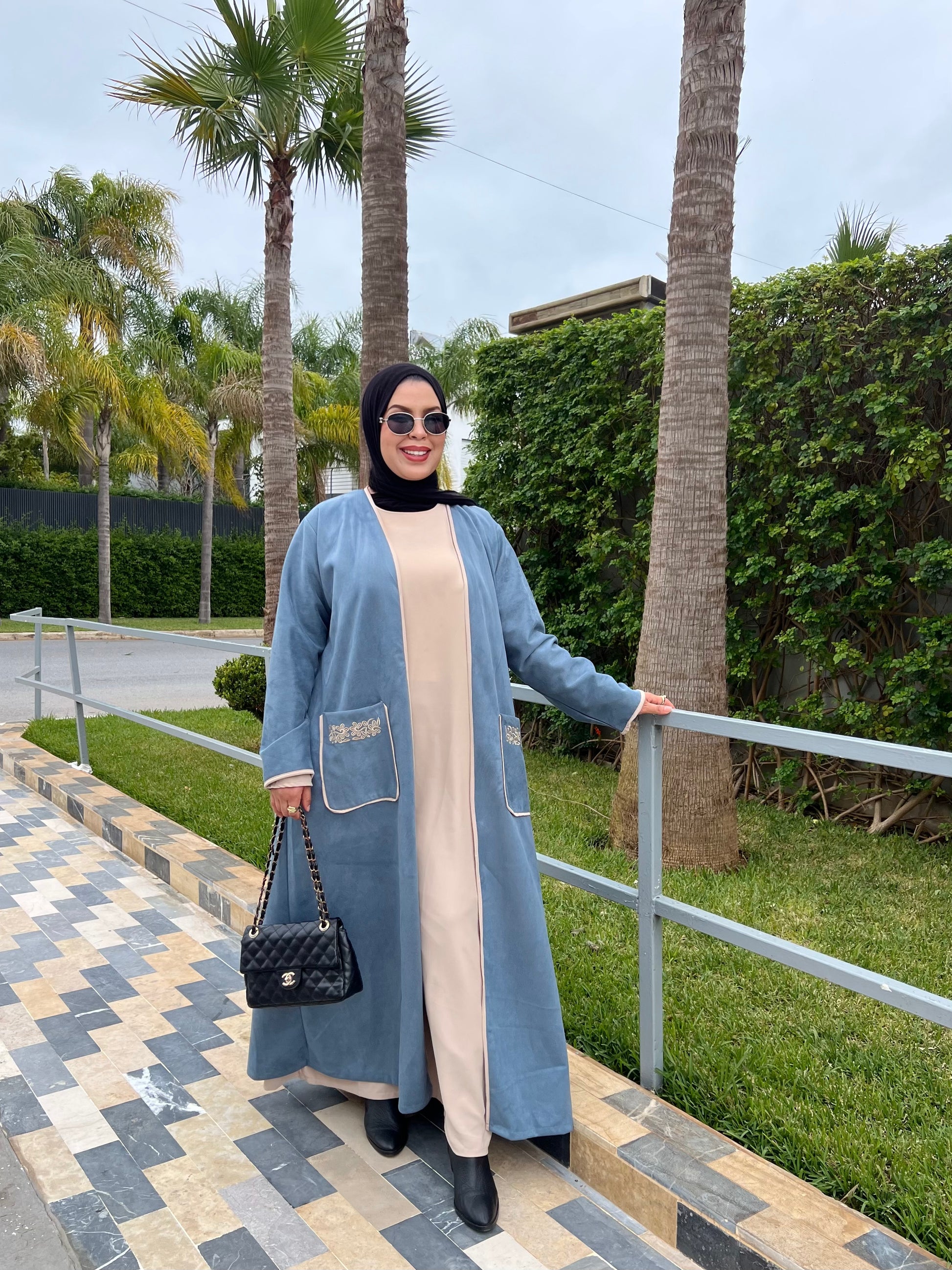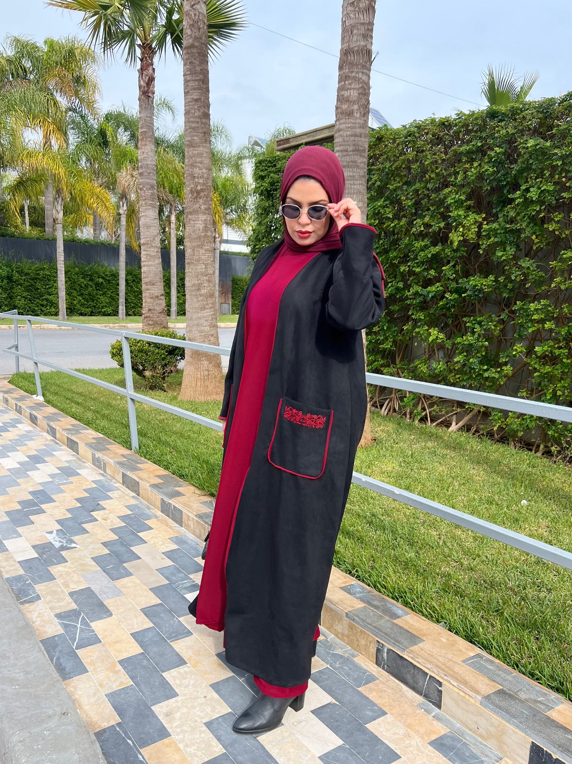 تمتعي بإطلالة ملكية تجمع بين الفخامة والراحة طقم مكون من قطعتين (عباية وكيمونو) مصمم خصيصاً للمحجبات اللواتي يبحثن عن التميز